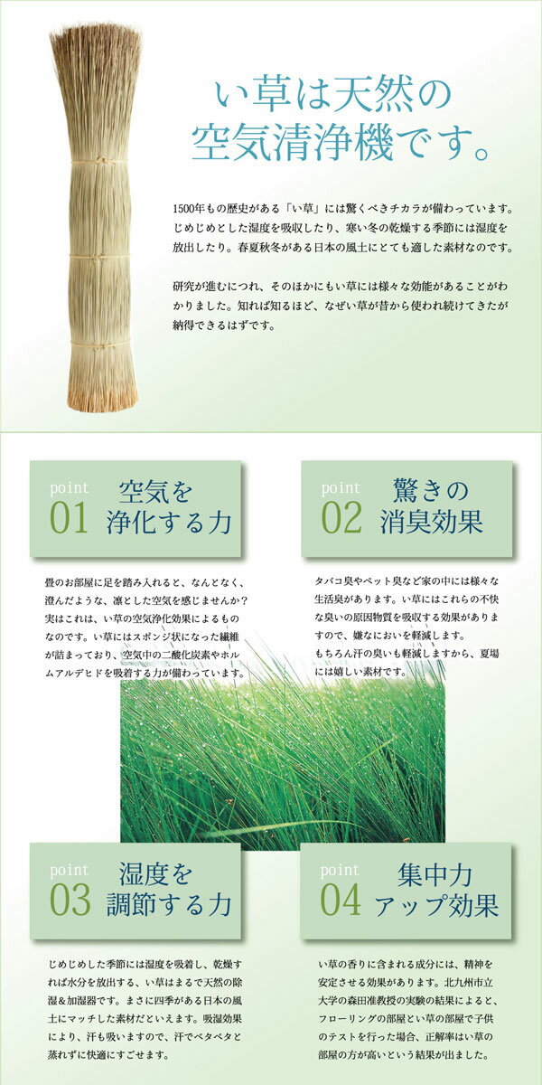 ■い草には空気の清浄化作用、湿度の調節作用があり、汚れにくいといった特徴があります。